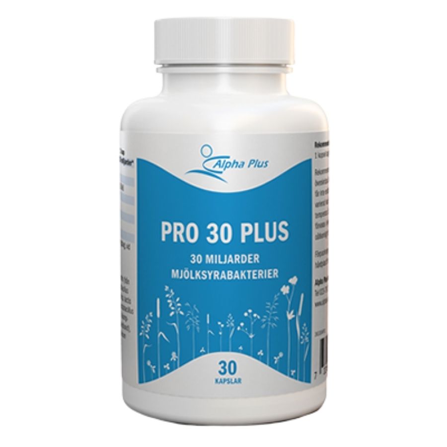 Upplev de kraftfulla fördelarna med Pro 30 Plus – en kraftfull probiotisk supplement, unikt framtagen för att stödja en sund mag- och tarmhälsa. Pro 30 Plus är ett mjölkfritt kosttillskott bestående av en imponerande kombination av åtta olika stammar av mjölksyrabakterier. Varje kapsel är fylld med 30 miljarder levande bakterieorganismer, vilket ger en koncentrerad dos av goda bakterier till din tarmflora.