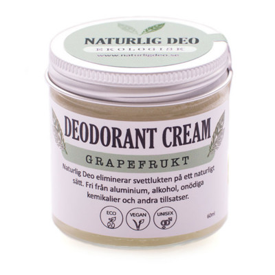 Ekologisk kokosolja (Cocos Nucifera Oil), Doftfri, mjukgörande och antibakteriell. – Ekologisk majsstärkelse (Zea Mays Starch), Fuktabsorberande. – Bikarbonat (Sodium bicarbonate), Aluminiumfritt livsmedelsklassat och finkornigt bikarbonat som eliminerar svettlukt. – Ekologisk jojobaolja (Simmondsia Chinensis Seed Oil), Vårdande och skyddande. – Ekologiskt karnaubavax (Copernicia cerifera cera), Skyddande samt höjer deodorantens smältpunkt. – Ekologisk grapefruktolja (Citrus Grandis Peel Oil), Bergaptenfri och antibakteriellt naturligt doftämne. Limonene finns naturligt i grapefruktoljan.